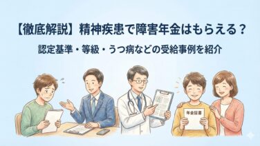 制度全般【徹底解説】精神疾患で障害年金はもらえる?認定基準・等級・うつ病などの受給事例を紹介 「うつ病で働けなくなってしまった……生活費はどうすればいい?」 「発達障害や統合失調症でも、障害年金はもらえるの?」精神疾患で療養中の方にとって、経済的な不安は病状にも悪影響を及ぼしかねません。実は、精神疾患も**「障害年金」**の受給対象... 2026.01.11制度全般